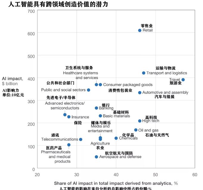 通过麦肯锡的图表数据,我们看到了人工智能的加速发展正在为企业创造价值,为经济增长做出贡献,并让我们在一些最困难的挑战领域里,取得难以想象的进展,为企业、经济和社会创造机会。