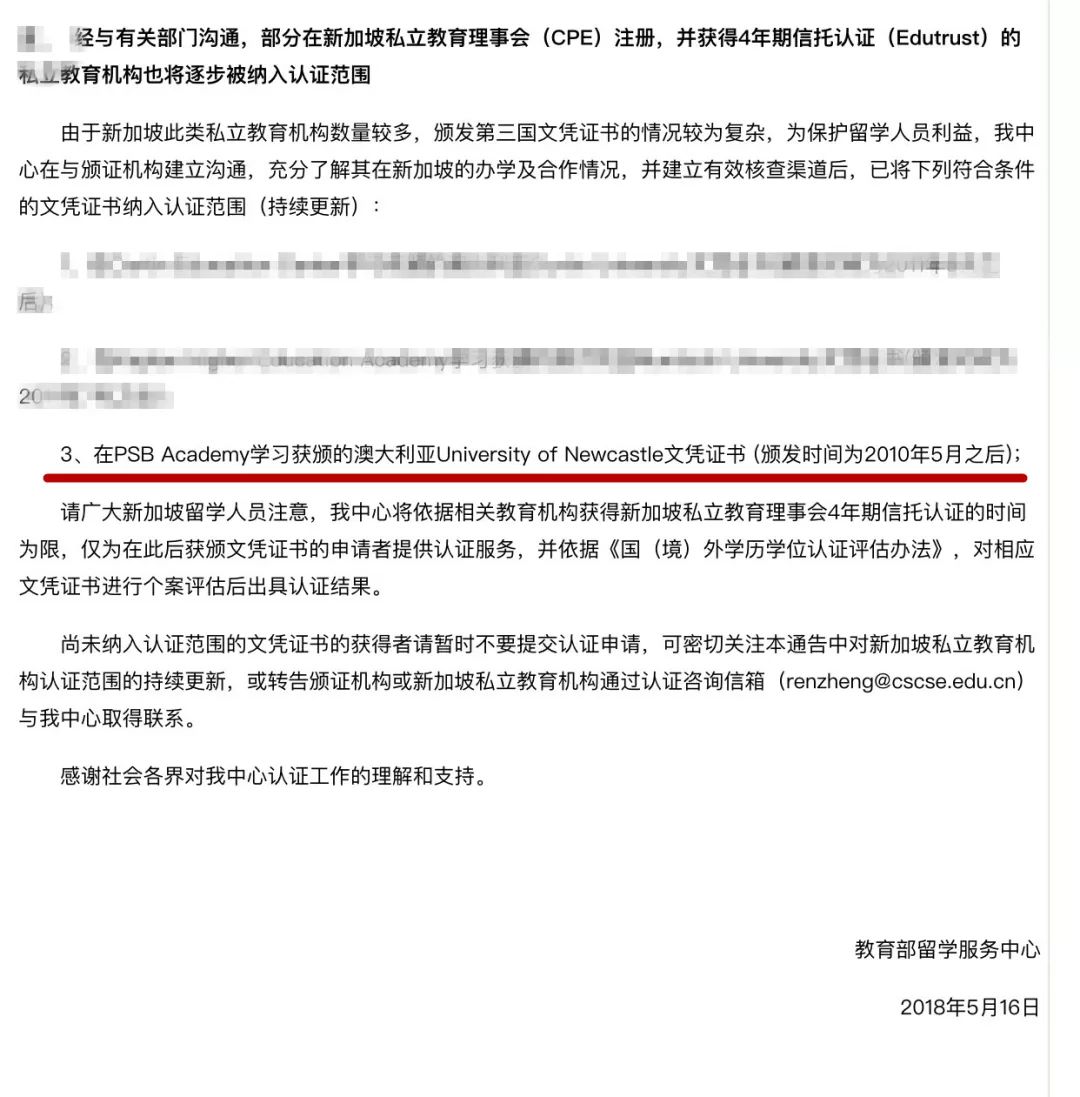 2018年5月16日,中国教育部留学服务中心主办的中国留学网发文公布《关于新加坡私立教育机构认证范围的公告》,“ 2010 年 5 月之后在新加坡 PSB 学院毕业获得的澳大利亚纽卡斯尔大学文凭 ”证书赫然在列!