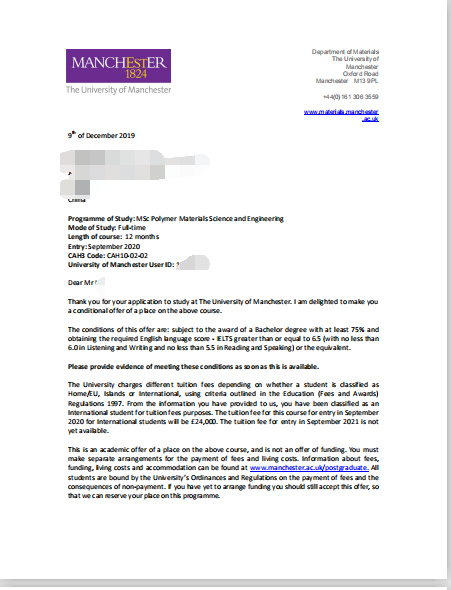 申请难点和细节:学生属于普通211背景,均分有84分,不过学生目标是世界排名前50的伦敦大学学院,爱丁堡大学何曼彻斯特大学,这几个学校不管从院校背景和均分成绩,对学生要求都非常高,学生的优势在于均分还比较好,但是实习其他经历不多,经过与学生沟通,文案老师针对每个专业的特点,写出来了不同侧重方向的文书,学生自己也提出了对文书专业方向的修改意见,然后反复提炼加工,尽可能的在文书素材和实习经历上进行了包装,重点阐述了申请动机和申请优势,最后成功录了曼彻斯特。