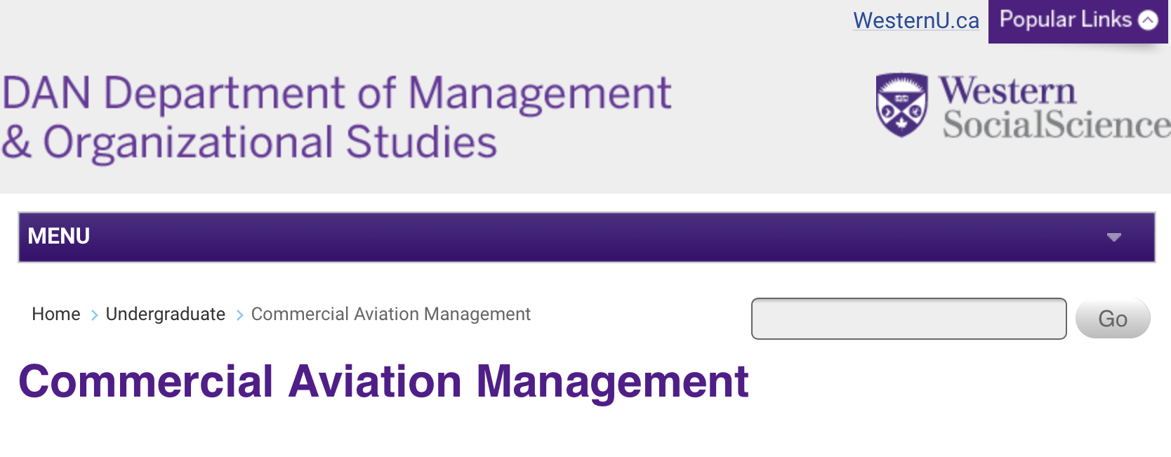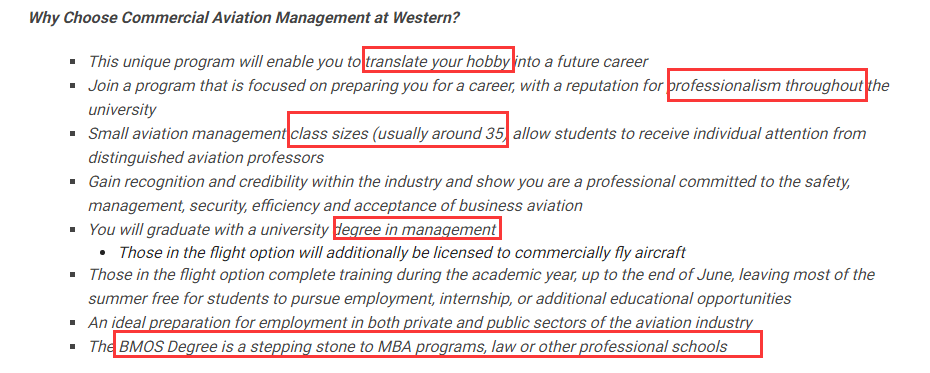 韦仕敦大学的商务航空管理学士学位,是一个4年制本科课程。管理与组织研究学士学位(BMOS)课程是加拿大本科学位的一项极富特色的课程,课程办学理念是:将大学的学术课与常规性商务学科结合起来,并且融合研究人类行为的社会科学基础性课程于一体,学生便能更好地为管理领域从业做准备。管理与组织研究学士学位课程能够培养学生会计学、金融学、市场学、运营管理、人力资源管理以及战略管理各方面的关键技能。