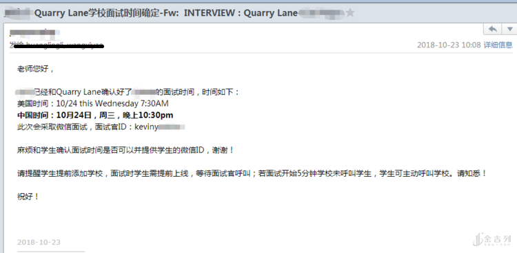 2019年春季申请,我申请了5所院校,在没有雅思/托福等语言成绩的情况下,金吉列帮我申请slep内测,拿到了最低托福要求80的quarry lane 的面试机会,以及rewoo christian school 、fremont christian school 等全部院校的面试机会。经过好几次的面试最后确认接收了意向院校rewoo christian school 的录取。