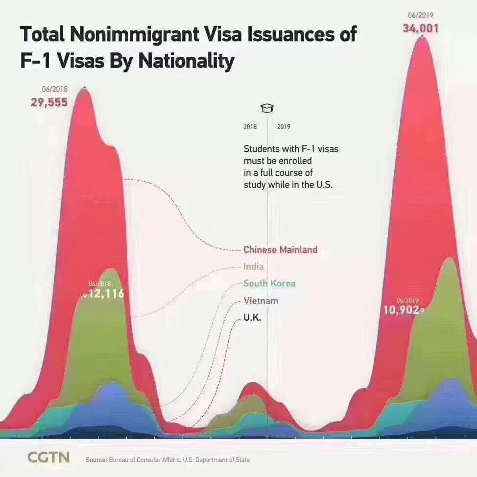 今年6月,美国大使馆向中国大陆学生发放了34001张F1学生签证,同比增长15%,印度学生同期下降10%。