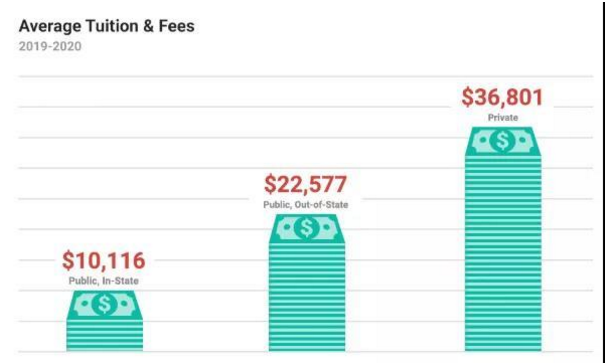 据U.S. News的数据显示,在2019-2020年期间, 私立大学学费平均为36,801美元,公立大学的州外学生为22,577美元, 公立大学的本州学生学费平均为10,116美元,比私立大学的平均标价低约73% 。