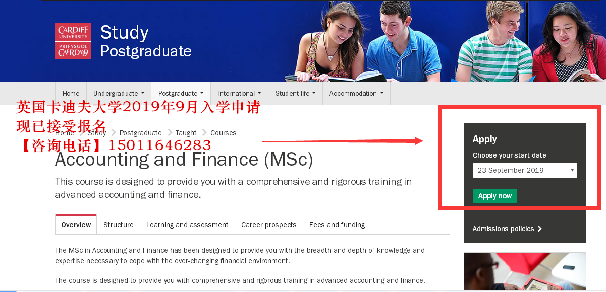 卡迪夫大学的研究生课程 2019 年 9 月入学申请现已接受报名,以下附上学校官网的申请通道截图: