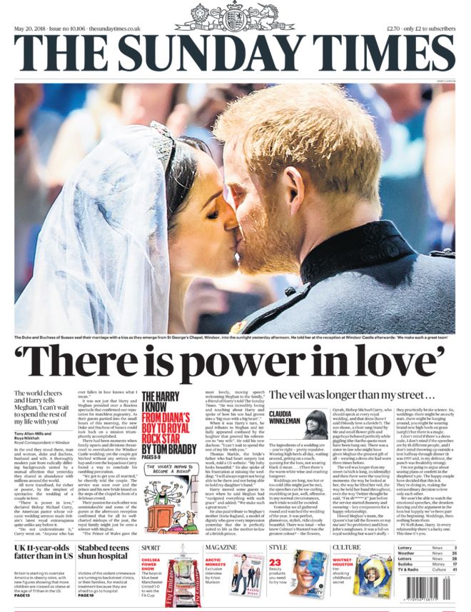 《星期日泰晤士报》(The Sunay Times)将这对夫妇描述为一对完全不同的现代情侣,他们在结婚当天和世界各地的数百万人分享了彼此的感情。它说,所有的东西都是通过最简单的眼镜——一对相爱的夫妇的婚礼——而变得更富有或更穷的。