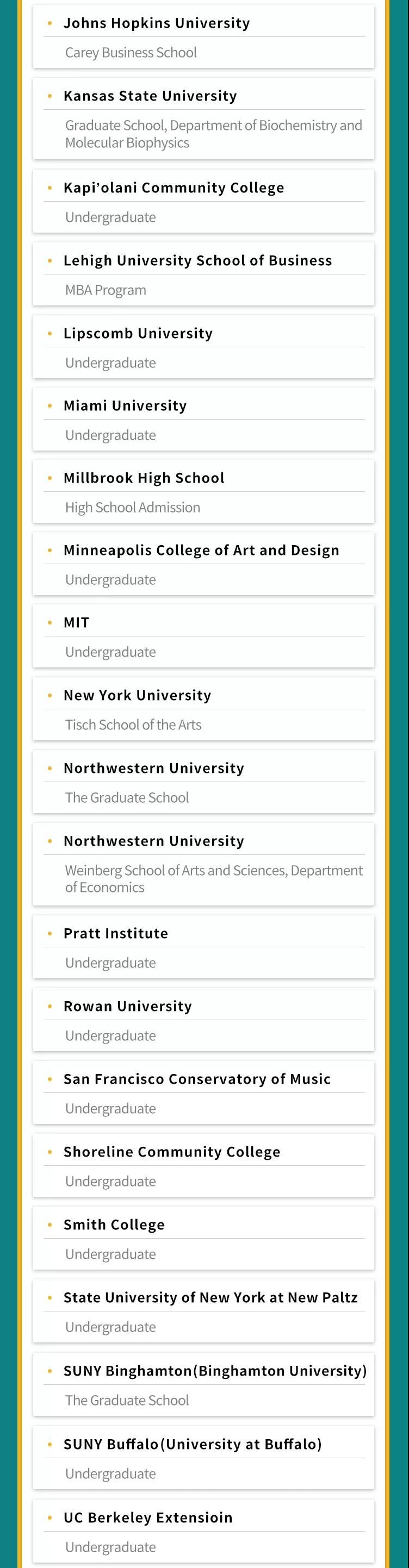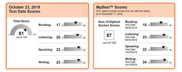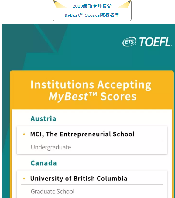 据ETS数据统计,在托福 推出MyBest™ Scores服务不到半年的时间里,已得到全世界12个国家、50余座城市、超过70所名校认可,74%的招生官希望在分数报告中看到MyBest™ Scores! 截止目前,包括 麻省理工学院本科项目、耶鲁大学文理研究生院、哥伦比亚大学法学院(L.L.M)、密西西比大学、卡内基梅隆大学设计学院与戏剧学院、纽约大学 Tisch 艺术学院、迈阿密大学、加州大学伯克利分校法学院、复旦大学泛海国际金融学院、法国埃塞克商学院、东京大学研究生院、国立首尔大学 在内的全球多所名校都已在官网上表示他们接受 MyBest™ Scores。