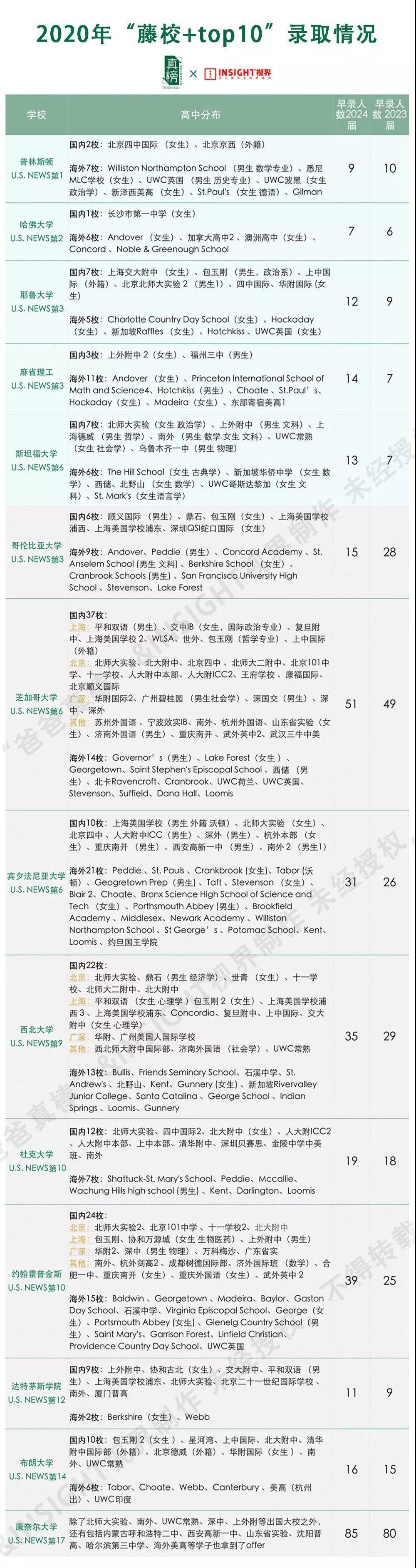 2019年藤校+Top10早申请offer总数为318枚,2020年为357份,与2019年录取相比,整体稳中有升,详情可点击大图查看: