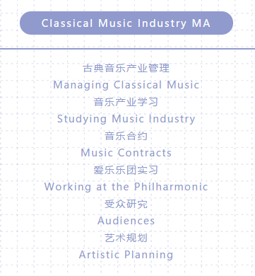 音乐方向的商科课程:Classical Music Inustry MA以及Music Inustry Stuies MA 。音乐学院的古典音乐产业和音乐产业研究专业,其实在课程设计上也是更偏重于市场应用。