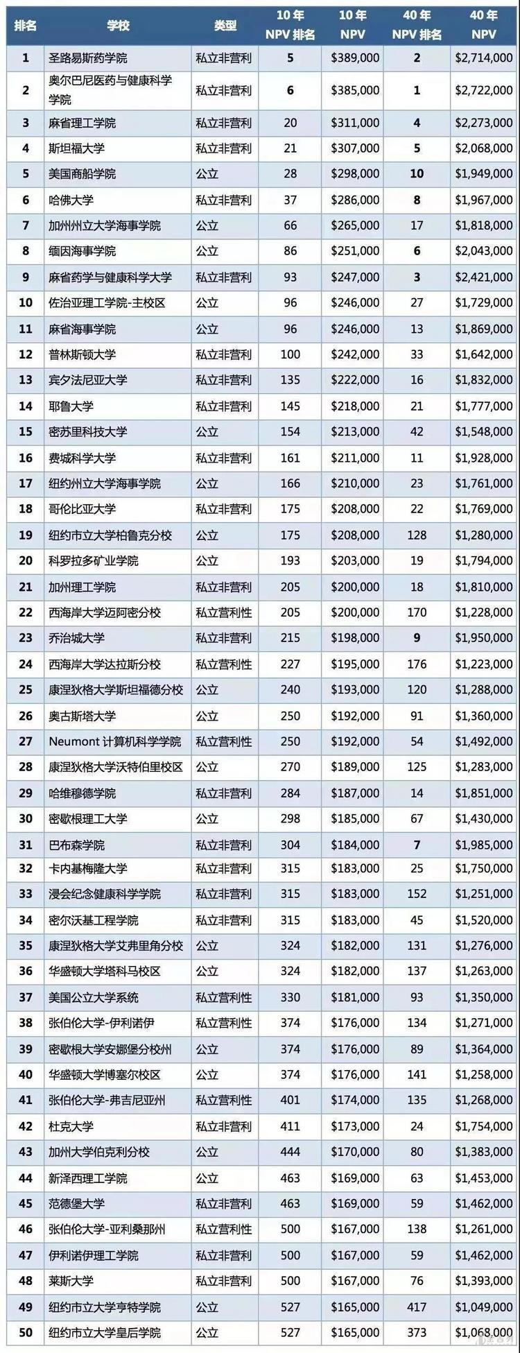 准备前往美国留学的同学中,大部分都打算申请4年制学士学位的项目,因此接下来我们重点看一下这类大学里,10年和40年NPV最高的前50所大学排名: