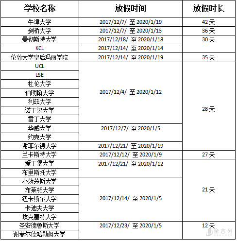 有些学校已经开启了,有些学校会在本周开始。要知道,圣诞假期期间,英国大学是不会处理学生的入学申请的。还在犹豫的同学可得抓紧时间,在圣诞假期前递交申请。或者,可以利用他们的圣诞假期,准备好完全的个人文书和材料,在圣诞假期一结束,就抢占先机。下面就给大家整理一下2019年英国大学寒假放假时间。