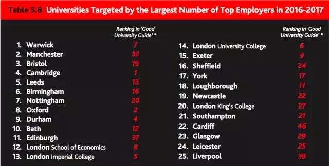 英国专业就职咨询机构(High Fliers Research)在2017年最新出具的调查报告里提到英国企业在招聘大学毕业生的时候都带有明确的院校倾向,他们分析了近几年英国就业市场的发展、就业岗位数量的变化,并综合了英国100家杰出企业招聘大学毕业生的数据,给出了一份最受大部分杰出雇主青睐的名单。 其中,布里斯托大学超过了牛津大学和剑桥大学排在了这份名单的第三位。