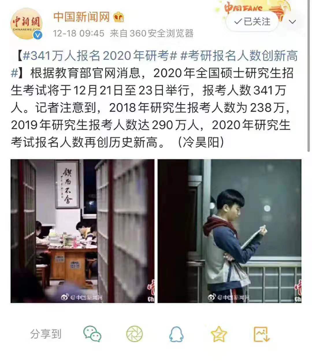 根据教育部官网的最新消息,2020年研究生考试报名人数再创历史新高,达341万人。2018年研究生报考人数为238万,2019年研究生报考人数达290万人。