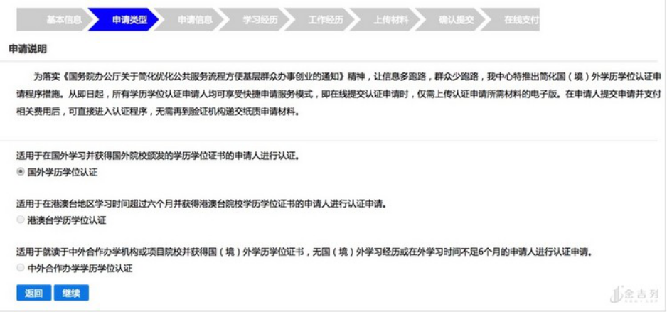 第二步是选择申请类型,分为国外学历、港澳台学历和联合办学的三个类型