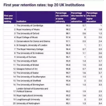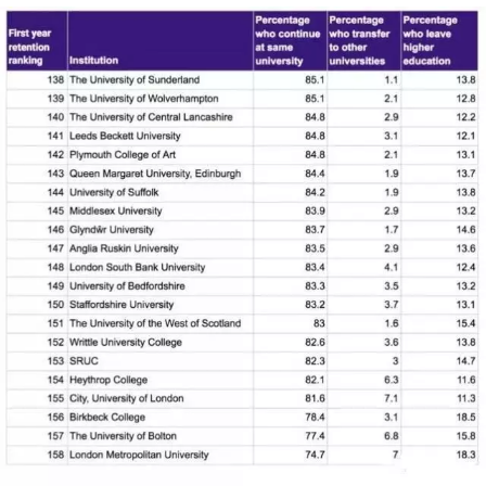 英国高等教育统计局 HESA(Higher Eucation Statistics Agency)曾调查统计了全英国191家提供大学高等教育的学校或机构,发布出全英数百所大学的通过率。榜单中,最容易挂科的大学为伦敦都市大学,通过率仅有74.7%,也就是说每10个人就有2.6个人不及格。