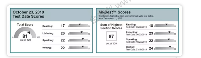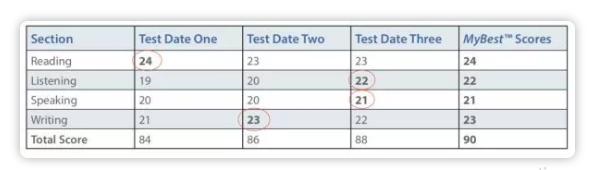 拼分也被称为「 My Best Scores 」,单从字面上就可以简单粗暴的翻译成:我最好的成绩。托福的拼分就是将考生在过去两年中所有有效托福考试成绩中每部分最高分数的总合。
