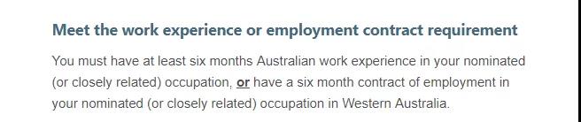 5、拥有提名领域或高度相关领域6个月澳洲工作经验,或6个月西澳境内劳务合同