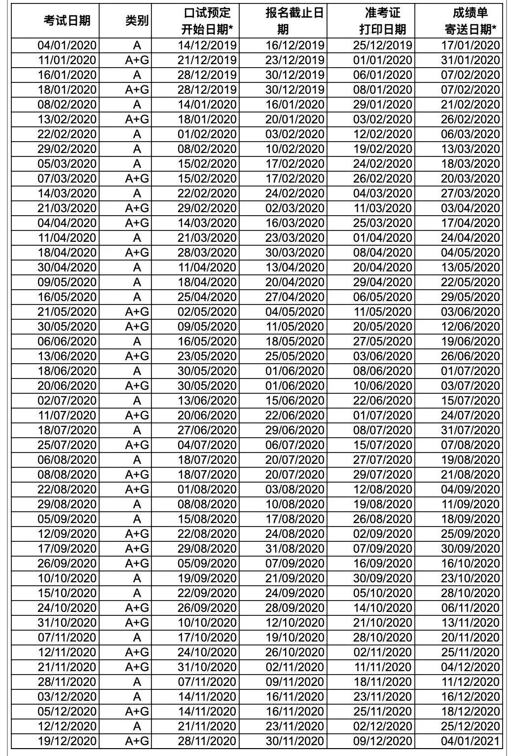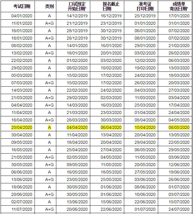2020 年用于英国签证及移民的雅思考试口试预订刚开始时间、 考试网上报名截止期、打印准考证时间和成绩表邮递时间