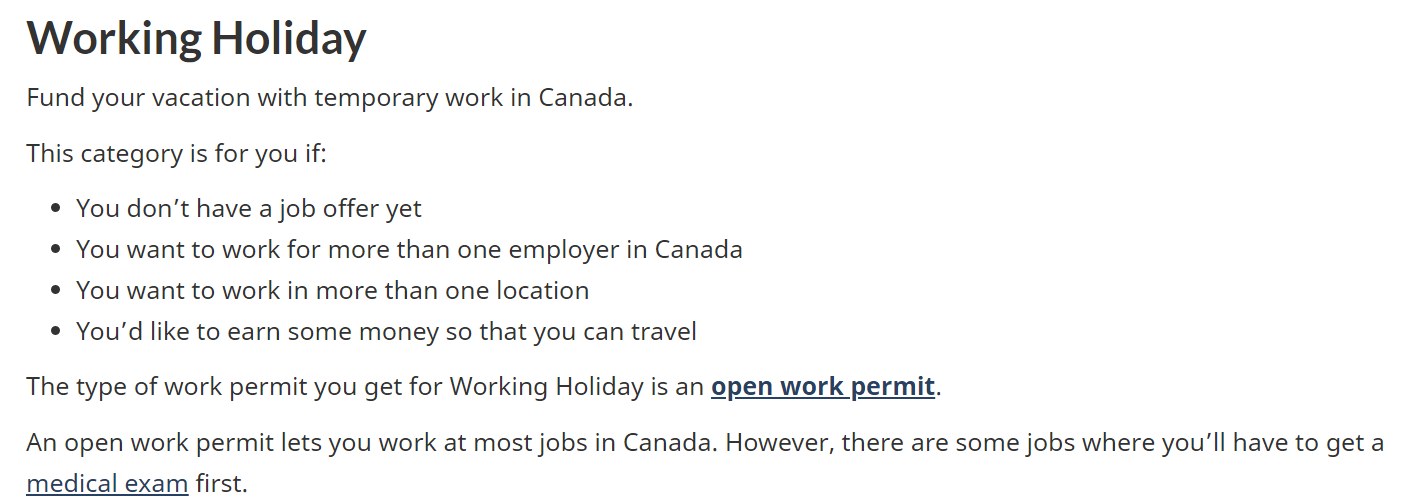 能为你的旅行经历增添一份不错的收入。 加拿大将向在 &lquo; 旅游打工 &rquo; 类别中成功申请的人发放开放工作许可证。开放工作许可证使人们可以在加拿大从事大多数工作,但是,在卫生部门工作或与弱势群体一起工作的人可能必须经过批准的医生进行体检。