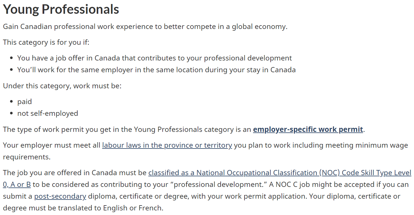 计划在同一地点为同一雇主工作,以供其在加拿大逗留期间的全部时间。必须提供工作职位,申请人不能自雇。成功的申请人将获得雇主特定的工作许可,这意味着他们只能在许可上指定的时间和地点为雇主工作。在这个类别下,你的雇主必须符合你计划工作的省或地区的所有劳动法,包括满足最低工资要求。在加拿大提供的工作必须被归类为国家职业分类 (NOC) 代码技能类型 0 级, a 级或 B 级,才能被认为对你的 &lquo; 专业发展 &rquo; 有贡献。如果能在申请工作许可的同时提交大专文凭、证书或学位, NOC 的工作可能会被接受。你的文凭、证书或学位证书必须翻译成英语或法语。