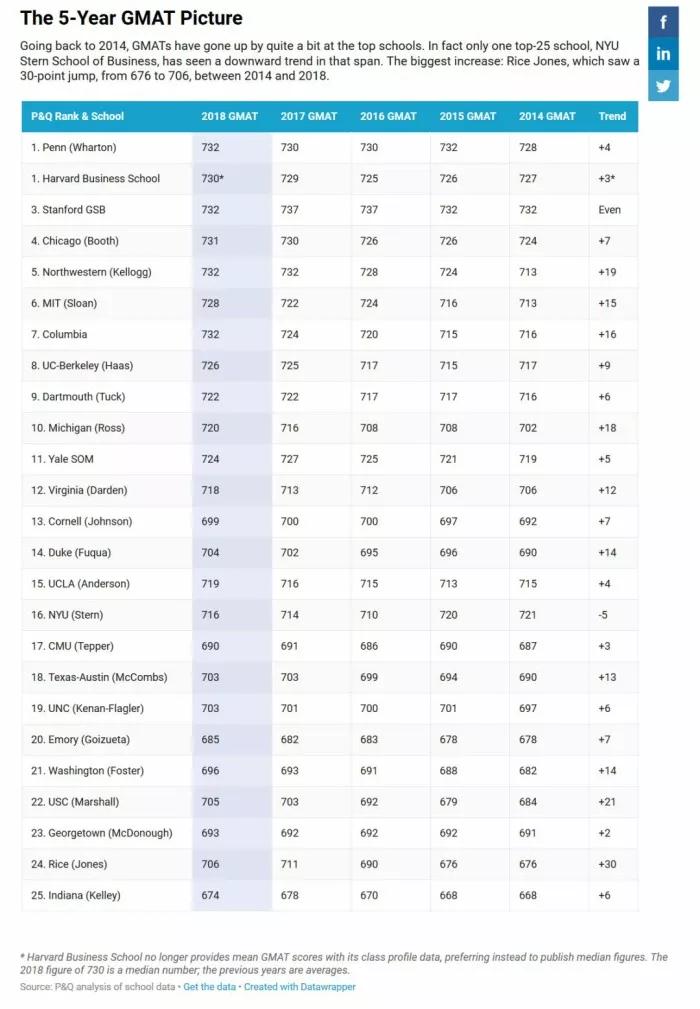 2018年,前25名中有6所大学的GMAT考试成绩逐渐降低,15所大学的GMAT考试成绩有一定的升高(均值升高3.1),3所大学环比增长。前十名中上涨幅度较大的是宾夕法尼亚大学(+8,升到732分)和麻省理工大学(+6,升到728分)。要想入读这两家高校的商科,你的GMAT得不顾一切的刷分呀。