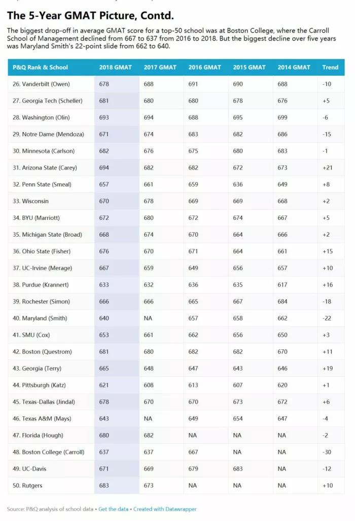 2018年,前25名中有6所学校的GMAT成绩逐年下降,15所学校的GMAT成绩有所上升(平均上升3.1),3所学校持平。前十名中涨幅最大的是哥伦比亚大学(+8,升至732分)和麻省理工学院(+6,升至728分)。想要就读这两所大学的商科,你的GMAT得拼了命的刷分呀。