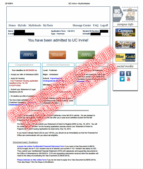 University of California, Irvine 2018年11月30号提交申请,2019年3月27号放入waitlist,2019年5月3号转正