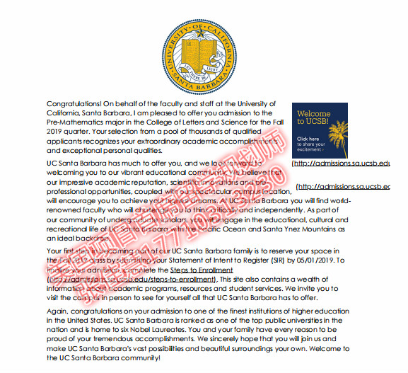 University of California, Santa Barbara 2018年11月30号提交申请,2018年3月27号录取