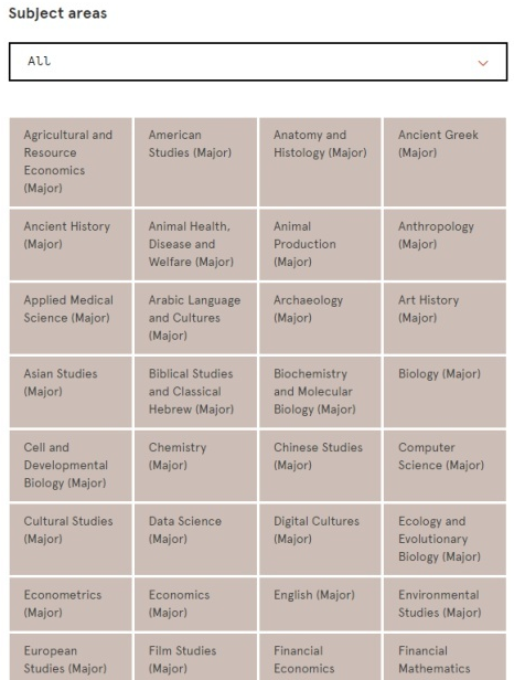 悉尼大学的18个学科分属三个学院,有非常广泛的课程供选择,而且课程在学院结构方面是灵活的、可变的。你根据自己的兴趣,任意选择所要学的课程,从会计学到土著学研究,从计算机科学到刑法,从运动训练科学到环境工程,从海洋研究到音乐,以及从通讯到泰语。悉尼大学拥有包括经济、商务、计算机、信息科学、视觉艺术、人文艺术、教育、心理学、社会学、健康科学、医学、护理学、兽医学、法律、音乐、自然科学、工程技术等上百个专业。可授予学士、硕士以及博士学位。