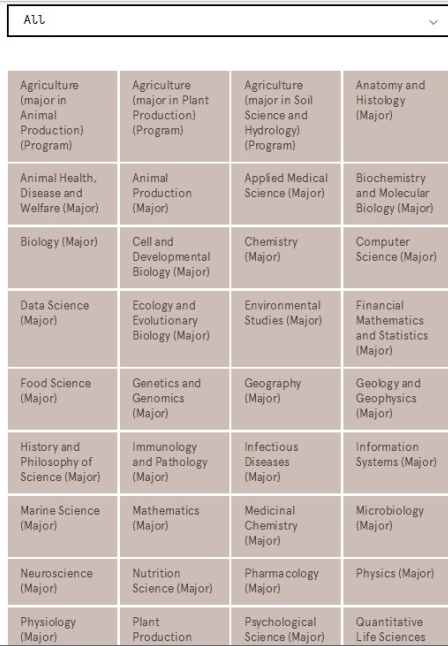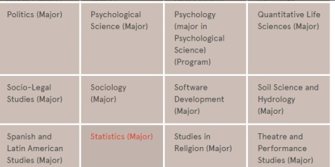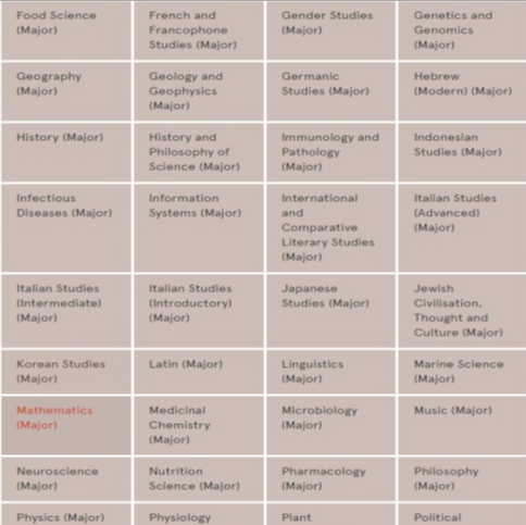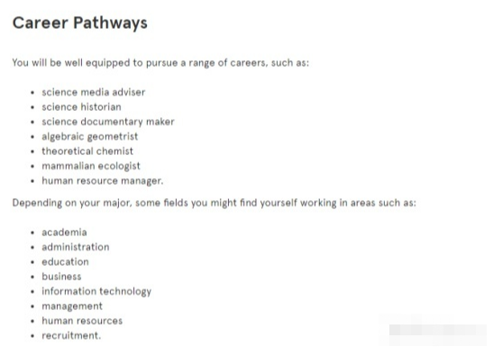 专业方向翻译:考古学,社会学,政治学,日语,中文, 软件发展(Software Development),生物学(Biology),计算机科学(Computer Science),统计学(Statistics), 营养学(Nutrition Science), 海洋科学(Marine Science), 心理学(Psychological Science), Data Science(数据科学),化学(Chemistry)等.
