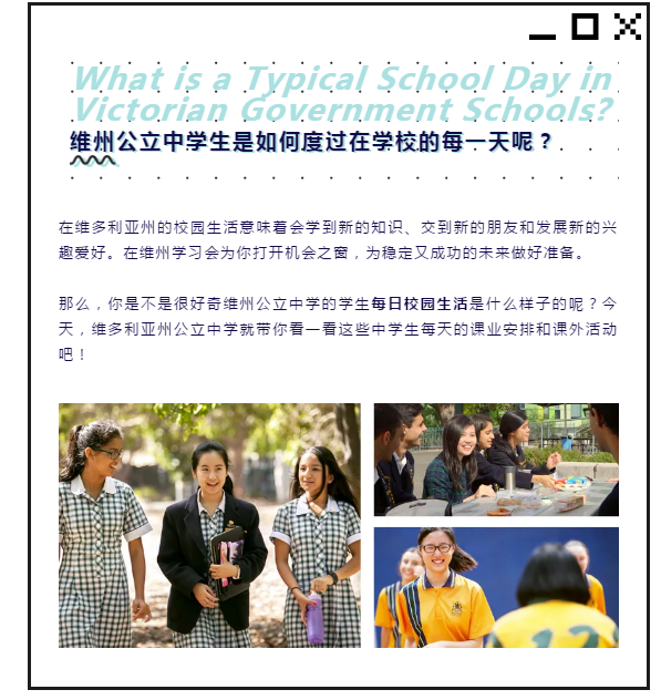 国际学生是维多利亚州公立学校和社区的重要组成部分,我们期待收到更多的入学申请,并由衷欢迎国际学生来到澳大利亚最好的教育之都墨尔本和蓬勃发展的维多利亚州。维多利亚州公立中学将持续为国际学生提供世界级的高质量教育和体验。