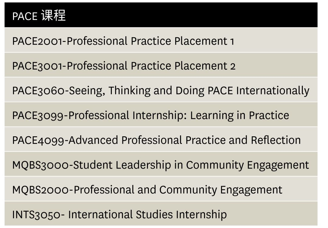 社会实践课程(Professional an Community Engagement,简称PACE) 是麦考瑞大学本科阶段的一门必修课程,为所有院系的学生们提供了丰富的机会,将所学的理论知识应用于实际工作当中