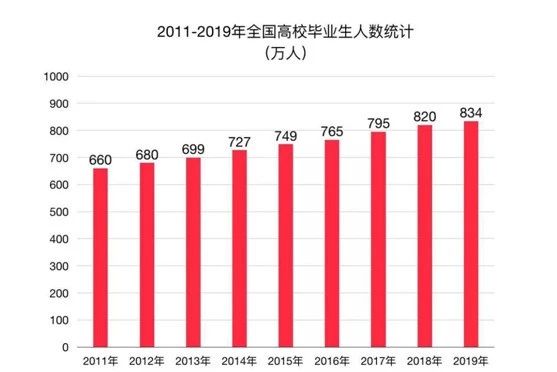 2011-2019年,我国高校的本科毕业生人数从 660 万增长到 834 万。高等教育的普及度高了自然是好事,却也从侧面反映了本科生的就业难度之大,竞争程度之激烈。本科生的身份早就不能像二三十年前那样:“哇,他是个大学生!”现在:“哦,本科生。”