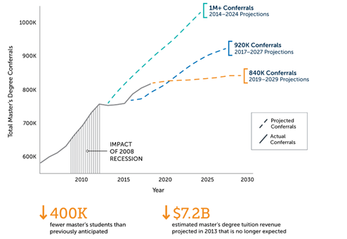 Megan Aams 说,如果我们假设硕士课程的平均完成时间为两年,那么每一年的每一次潜在的录取都代表我们会失去两名学生。像前面提及的那样,硕士生可能在 2014-2024 年之间减少 200,000个。据保守估计,整个美国市场上的硕士学位学费收入将减少约 72 亿美元,这也是为什么近些年大学学费接连上涨的原因。