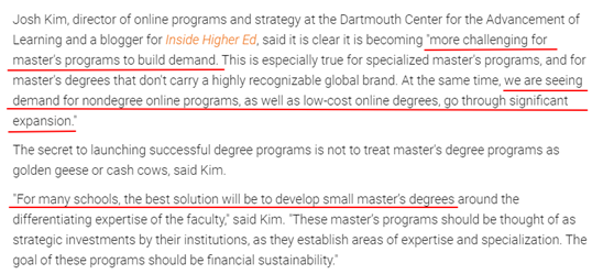 除此之外,Josh Kim 还说,最好的解决办法就是围绕教师的专业知识发展小型硕士学位。这类的硕士课程与其专业领域被大学机构视为战略性投资,课程的目标是财务可持续性。换句话说,既满足了生源对硕士学位的需求,又可以根据学术领域的不同保证其质量,这是美国未来几年的硕士项目发展趋势。