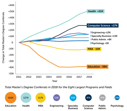 据数据显示,之前几乎每个专业领域的硕士学位都在增长。但是在 2011年,市场分裂了。计算机科学,工程学和卫生专业的学位在增加,而其他大多数领域则在下降。Aams 写道,这些专业的突破式增长看似是一个亮点,也吸引了很多学生进入这个领域,但要知道,计算机科学,工程学和医疗保健领域都是教学成本很高的学科,招募教师的成本使机构难以提供这些课程或防止成本超过收入,这或许也是硕士学位下降的原因之一。