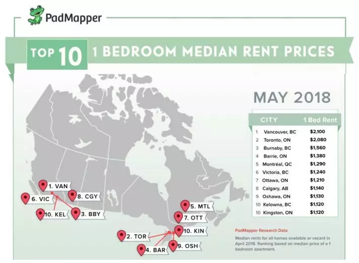 加拿大租房网站PaMapper最近发了一个主要城市的房租报告,统计了最新5月份,各个城市的平均房租….