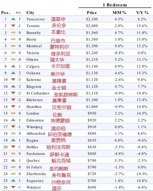 以下就是加拿大26个城市, 5月份的平均房租 :