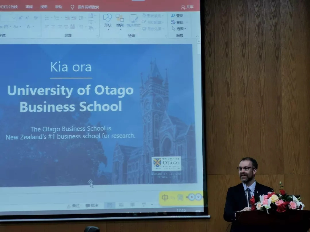活动开始,奥塔哥大学副校长、奥塔哥商学院院长 Robin Gaul教授致辞 。首先,他欢迎四期DBA学生的参加,并向在座各位学员介绍了奥塔哥商学院最近取得的成果和未来规划。在最新公布的学科排名中,奥塔哥商学院MBA课程排名新西兰第一、亚太区21-25(QS),Tourisim旅游专业全球排名第十四位(Worl Leisure Centre of Excellence)。奥塔哥大学奥塔哥商学院同时拥有EQUIS(欧洲质量发展认证体系)和AACSB(国际商学院促进协会)两项国际权威商学院认证,并且是AAPBS(亚太管理学院联合会) 和 PIM (Partnership in International Management)成员。同时,他表示:未来几年,奥塔哥商学院战略发展包括奥塔哥全球卫生健康机构合作、奥塔哥能源研究中心合作、商业可持续发展研究和计算机技术在商业领域的应用(自动化、AI和大数据)。