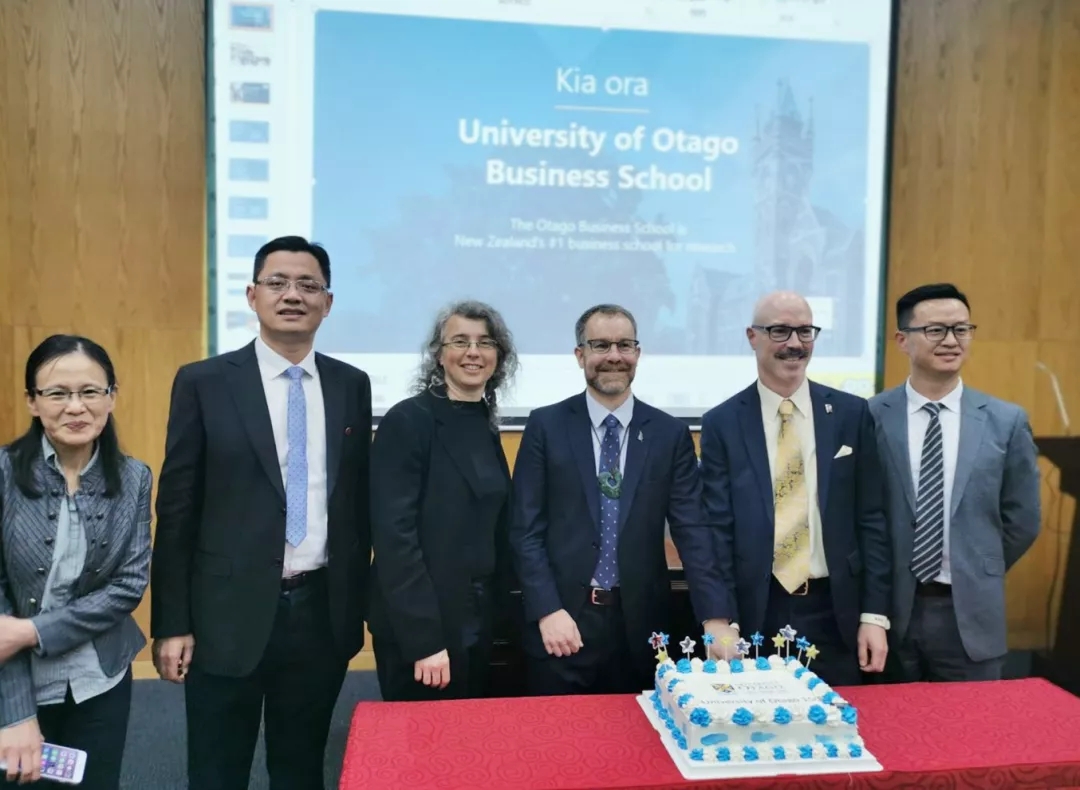 最后,新西兰驻沪副总领事Tom Barker先生发言。他祝贺新西兰最古老的大学&mash;奥塔哥大学在今年迎来了建校150周年。他也十分高兴,能有机会与在场的各位商界精英交流学习。活动的最后,Tom Barker先生与Robin教授共同进行了奥塔哥大学150周年庆祝仪式。学术活动至此完美结束。