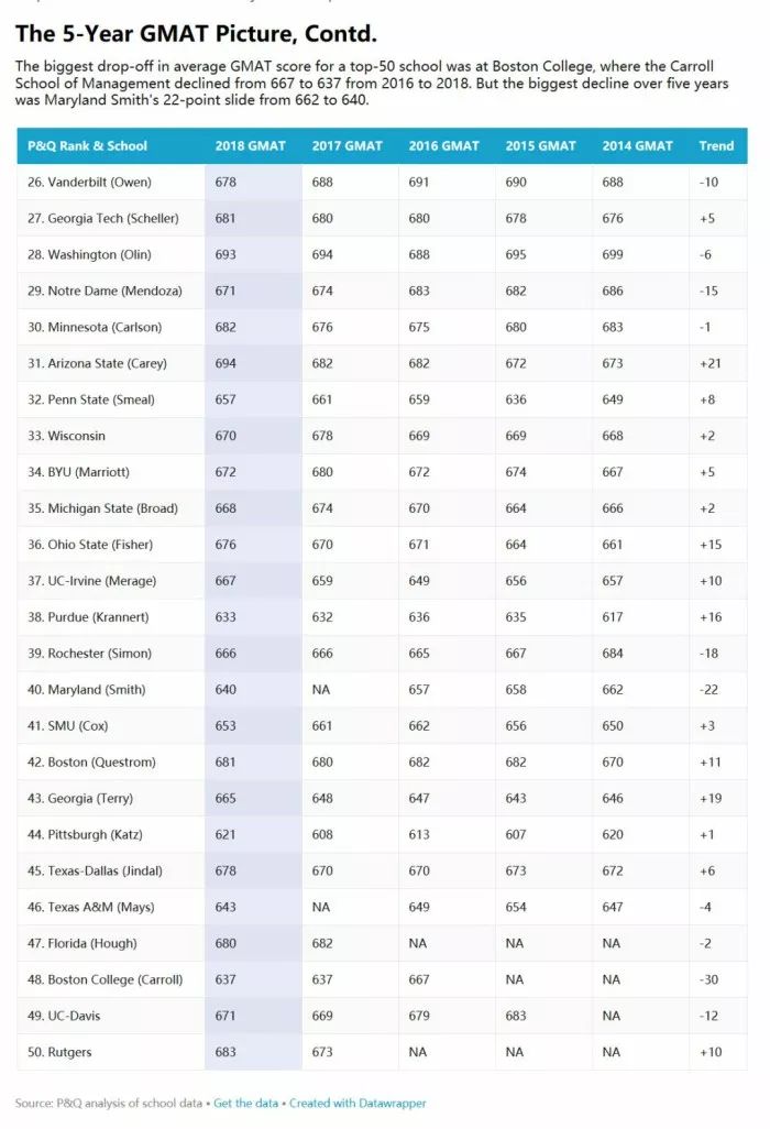 2020年的申请大战已经在火热进行中,商科作为中国学生最喜欢的学科之一,越多越多的考生也正在准备冲刺最后的GMAT分数。近期,Poets & Quants 网站发布了美国TOP50商学院的GMAT录取均分。