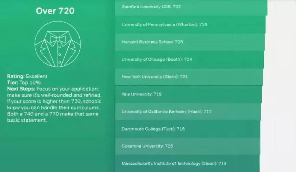 ▍GMAT高于720分 作为全球top10%的第一梯队考生,坐拥720以上的高分的你几乎已经可以去尝试申请任何一所自己心中的梦校了。