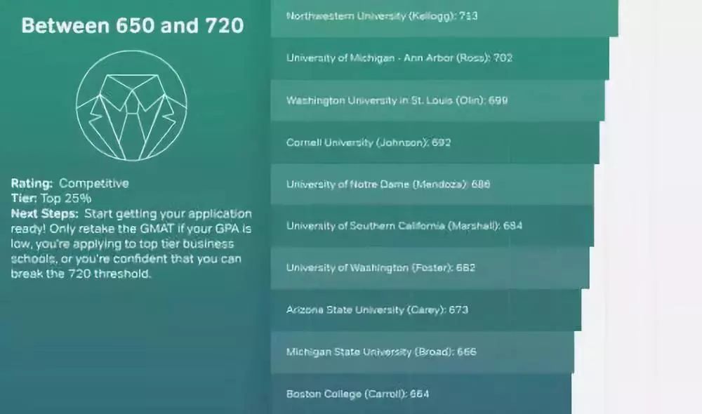 ▍GMAT分数介于650分-720分之间 对于第二梯队的考生,尽管分数上对于第一梯队来说可能稍显劣势,但在商学院研究生申请中已经很有竞争力了。