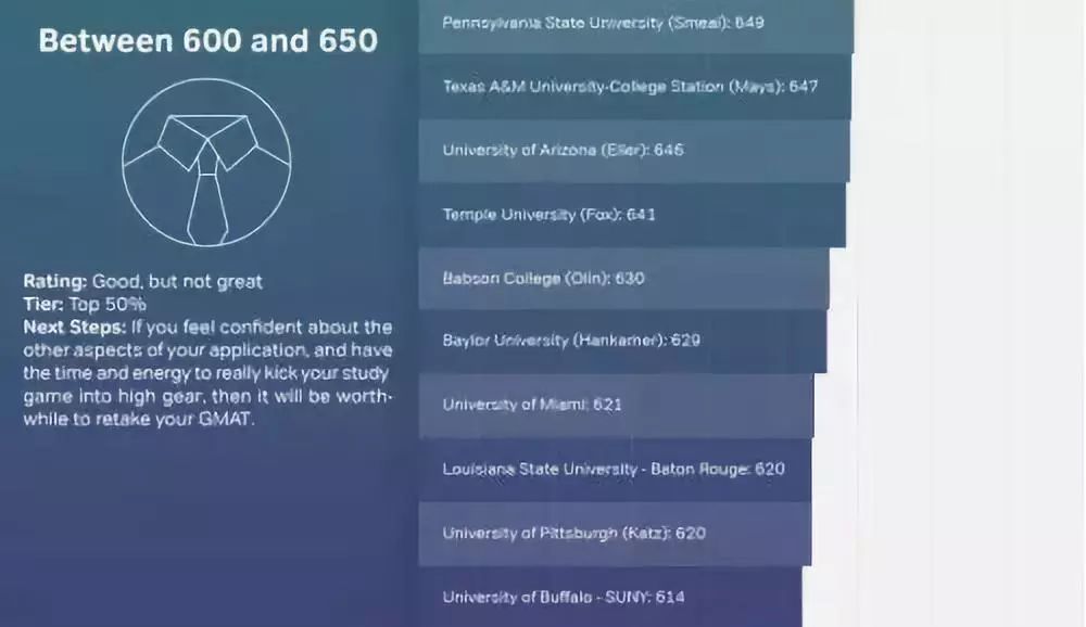 ▍GMAT分数介于600分-650分之间 对于600~650这个“可以但并不很好”的分数段,Magoosh给出的建议是:如果你的实习经历,GPA等其他条件都不差,同时也有充足的时间和精力,那么为了不让GMAT成为你申请路上的绊脚石,继续备考GMAT也不失为一个提高录取率的好方法。