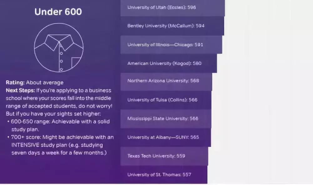 ▍GMAT低于600分 即使现在的你落在了About Average这最后一个梯队中也不必感到过分焦虑,上文中也提到了,这是中国乃至世界考生的平均分。毕竟数据也表明,不是没上600就没书读。例如犹他大学,伊利诺伊芝加哥分校,美国大学等学校的录取都对第四梯队的考生很友好。