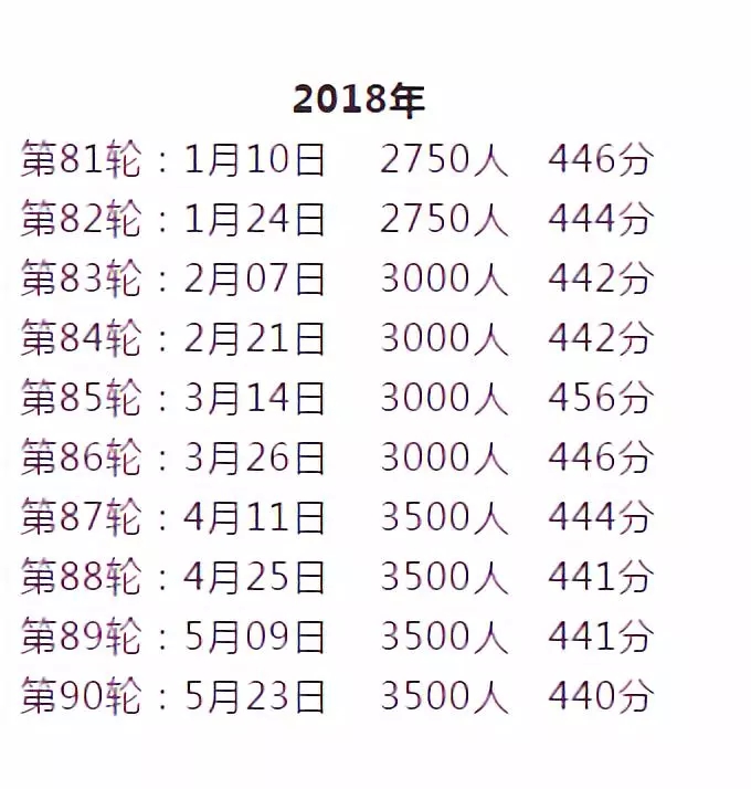 从今年以来的情况,我们不难看出, 1 月 10 日的第 81 轮( 2018 年第一轮)甄选开始, EE 邀请分数线就一直在 445 左右徘徊,虽在 3 月 14 日的第 85 轮中略微上升至 456 ,但在 3 月 26 日又低回了 446 ,可见今年上半年的 EE 邀请分数整体不高,就只有一次超 450 的线,另外此次的 440 也是今年目前 10 轮抽签的最低分数线。