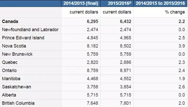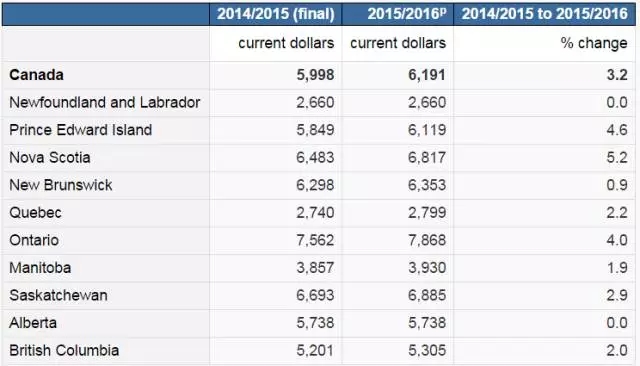 研究生学费最高的是安省 ($8,971)、其次是新斯科舍($8,502) 和BC省($7,801)。