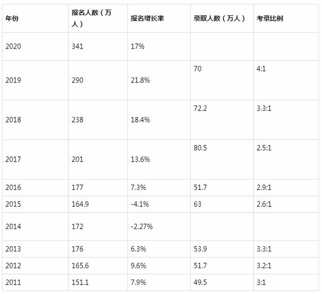 12月21日-23日,是2020年全国硕士研究生招生考试时间。数据统计,2020年报考人数为341万人,比2019年增加了51万!每年的考研人数都在上涨,“考研”成为一种热潮。有统计数据显示,自2011年以来,中国考研报名人数除在2014、2015年稍有下降,其余年份都呈增加态势,2017、2018年增幅更在10%以上。中国教育在线此前发