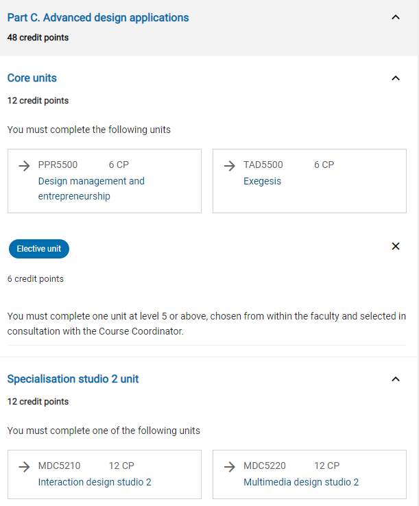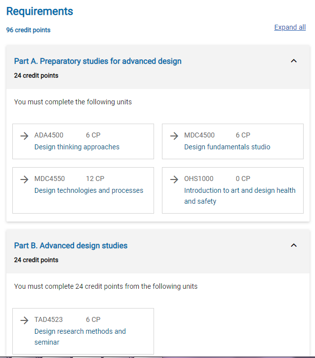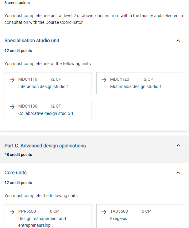 莫纳什大学的设计硕士是以项目为基础、以工作室为中心的课程,是1-2年的学制,有没有专业背景都可以读,有专业背景可以减免学分到1年或者1.5年,该课程是理论和实践相结合的一个项目,一个有三个方向,能让你在交互设计、多媒体设计或协作设计等专业领域拓展学习的机会,或者综合这几个方向,建立一个设计的高级研究学习: