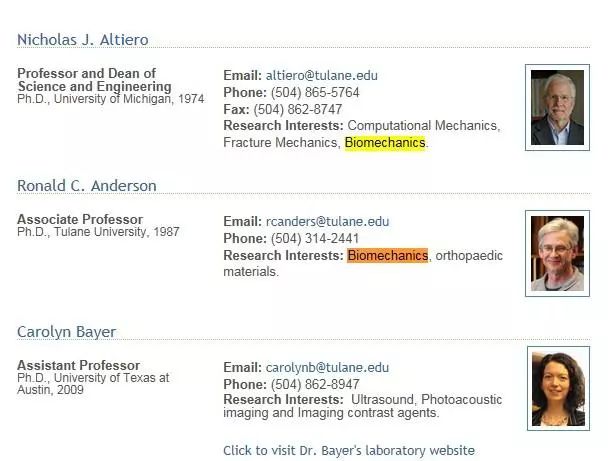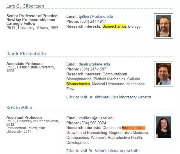 所谓 “术业有专攻”,所以同学们在确定好学校和专业的前提下,第二个步骤就是明确方向以及该方向的教授。以 Tulane 大学为例,该校 Biomeical engineering 任课老师有 19 位,但是 Biomechanics 方向的只有 5 位,以下为部分截图。那么,如果学生对这个方向感兴趣,就需要去这几位老师主页了解情况,然后进行针对性套磁。