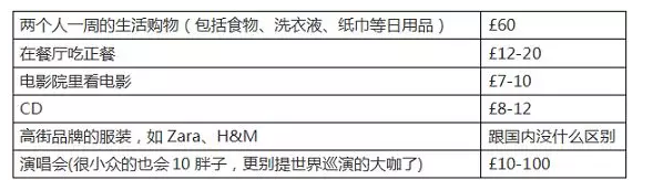 根据WORKgateways网站(专门为对英国消费水平不了解的工作、学习人群提供信息), 小编简单列了几项日常活动/消费的费用,均是平均水平。